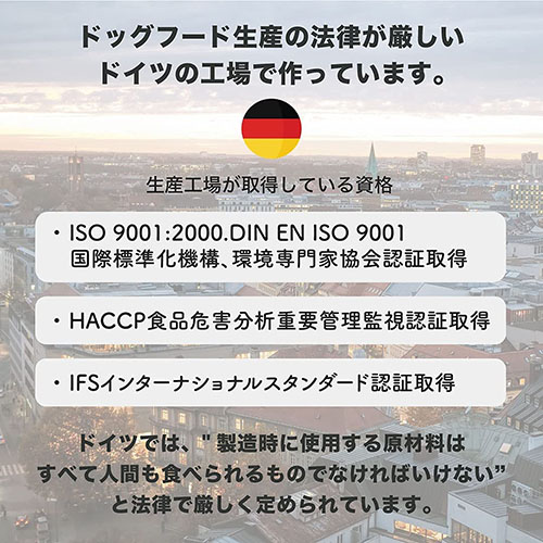 ■愛犬の健康に配慮し、穀類・人工添加物不使用のグレインフリードッグフード ■人工添加物の代わりに、同じ役割を担うハーブやフルーツを配合したこだわりのレシピ ■第一原材料に動物性たんぱく質を使用し、愛犬の嗜好性をアップ ■全犬種・全年齢の愛犬におすすめ ■ISOやHACCPなどの資格を取得しているドイツの工場で製造