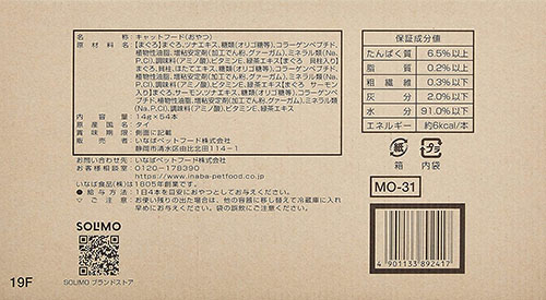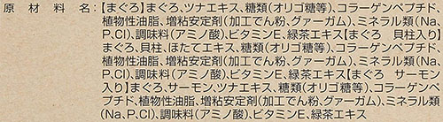【まぐろ】まぐろ、ツナエキス、糖類(オリゴ糖等)、コラーゲンペプチド、植物性油脂、増粘安定剤(加工でん粉、グァーガム)、ミネラル類(Na、P、Cl)、調味料(アミノ酸)、ビタミンE、緑茶エキス【まぐろ 貝柱入り】まぐろ、貝柱、ほたてエキス、糖類(オリゴ糖等)、コラーゲンペプチド、植物性油脂、増粘安定剤(加工でん粉、グァーガム)、ミネラル類(Na、P、Cl)、調味料(アミノ酸)、ビタミンE、緑茶エキス【まぐろ サーモン入り】まぐろ、サーモン、ツナエキス、糖類(オリゴ糖等)、コラーゲンペプチド、植物性油脂、増粘安定剤(加工でん粉、グァーガム)、ミネラル類(Na、P、Cl)、調味料(アミノ酸)、ビタミンE、緑茶エキス
